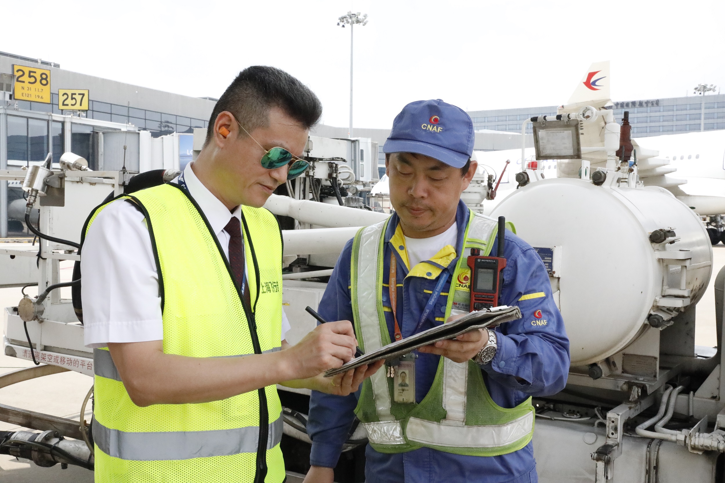 航班起飛前,機(jī)務(wù)工程師與東航A350機(jī)長(zhǎng)季紅華進(jìn)行最后的工作交接與確認(rèn)
