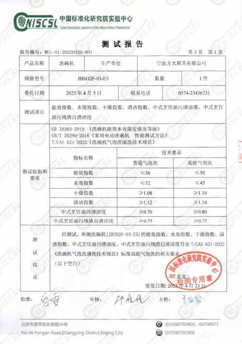 2022年,方太聯(lián)合中國家用電器研究院發(fā)布首個《洗碗機氣泡洗清洗技術(shù)規(guī)范》,此次舉辦的媒體溝通會上,方太水槽洗碗機新5系又通過了中國標(biāo)準(zhǔn)化研究院完成技術(shù)驗證,經(jīng)由嚴(yán)苛的技術(shù)測試和實效檢驗,測試結(jié)果最終為,能效指數(shù)50、水效指數(shù)45、干燥指數(shù)1.29、清潔指數(shù)1.24、中式烹飪油污清潔度0.87、中式烹飪油污殘渣自清潔度0.77,各項指標(biāo)均符合要求,其中干燥指數(shù)、清潔指數(shù)均高于國家一級水效標(biāo)準(zhǔn)基數(shù),且對中式烹飪油污的清潔效果顯著。
