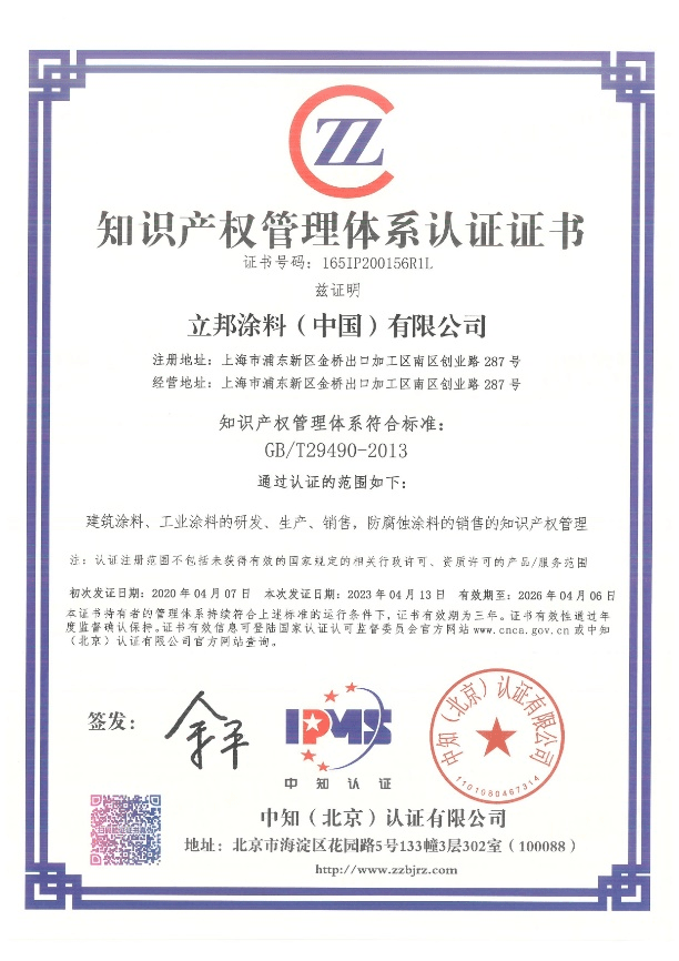 有力支持全面創(chuàng)新”為主題的2023年全國知識產權宣傳周活動[1]正如火如荼地進行。作為創(chuàng)新驅動型企業(yè),立邦始終注重知識產權的管理和保護,以此保障嚴謹的技術研發(fā)工作,穩(wěn)步提升自主創(chuàng)新能力。近日,立邦順利通過國家知識產權管理專業(yè)機構評審,再次獲得《知識產權管理體系認證證書》,為自身進一步規(guī)范知識產權管理,增強核心競爭力打下了堅實的基礎。