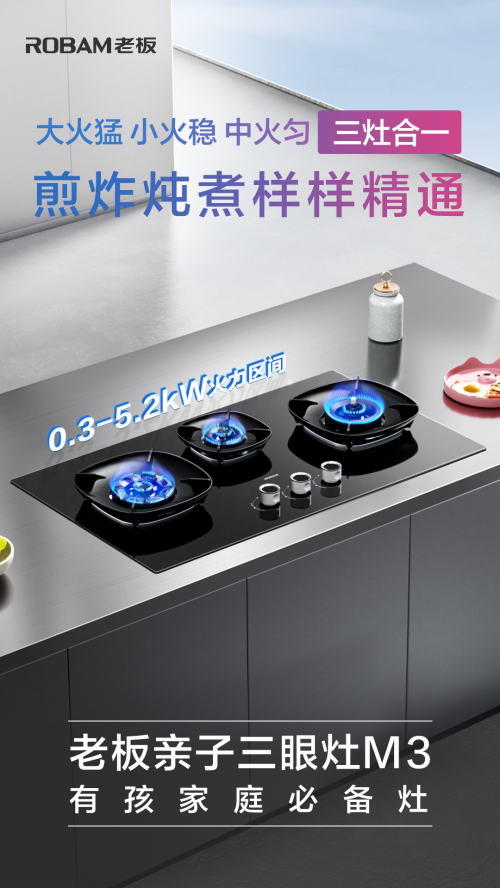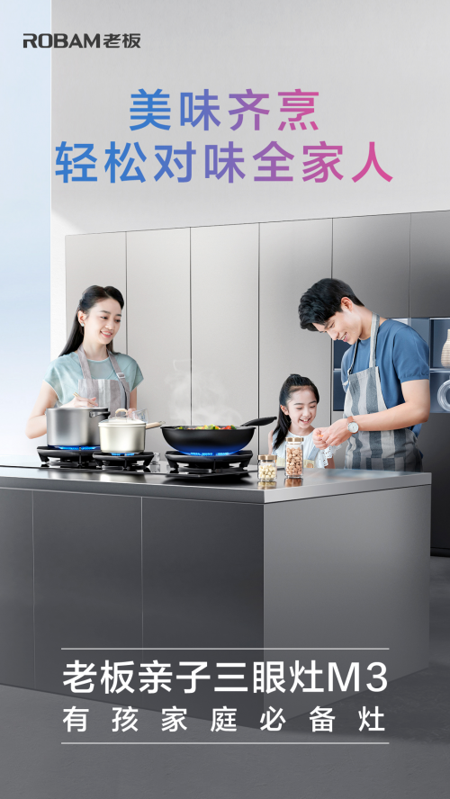 有娃家庭人口多烹飪?nèi)蝿?wù)重,孩子吃的小分量食物烹飪難度大,且多代同堂對(duì)烹飪技法要求高。老板親子三眼灶M3的發(fā)布,讓眾多難題迎刃而解,烹飪變得趣味無窮,廚房生活更輕松。