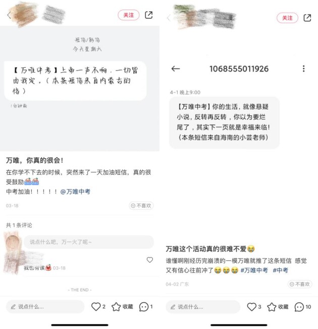 五年來(lái),萬(wàn)唯中考已為全國(guó)20多萬(wàn)名學(xué)生發(fā)送超1000萬(wàn)條暖心鼓勵(lì)短信,每年都被眾多師生點(diǎn)贊,來(lái)看看下面的神回復(fù)吧。