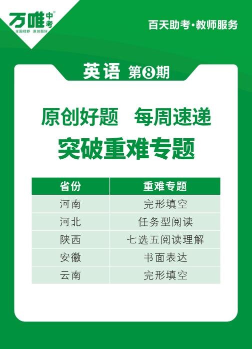 為使師生在中考前更加精準(zhǔn)、高效地備考,3月15日—6月9日期間,萬(wàn)唯中考持續(xù)為河南、河北、陜西、安徽、云南5省區(qū)初三師生推送七科原創(chuàng)好題等資料,截至目前,已有超3萬(wàn)名老師每周通過(guò)所在的微信群獲取。