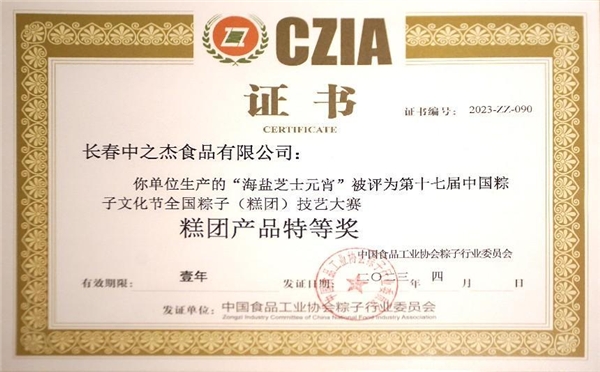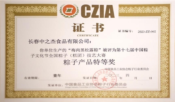 2023年4月19日,中之杰再次驚艷亮相中國(guó)粽子文化節(jié),一舉斬獲三項(xiàng)全國(guó)大獎(jiǎng)。中之杰的梅肉黑松露粽作為創(chuàng)新產(chǎn)品,從原料、工藝、口感、顏值等各個(gè)方面都受到行業(yè)專(zhuān)家推崇,同時(shí)斬獲全國(guó)(糕團(tuán))技藝大賽雙冠王——大賽最高獎(jiǎng)項(xiàng)“粽子產(chǎn)品特等獎(jiǎng)”和“粽子產(chǎn)品創(chuàng)新獎(jiǎng)”,中之杰海鹽芝士炸不爆元宵榮獲全國(guó)(糕團(tuán))技藝大賽最高獎(jiǎng)項(xiàng)“糕團(tuán)產(chǎn)品特等獎(jiǎng)”。