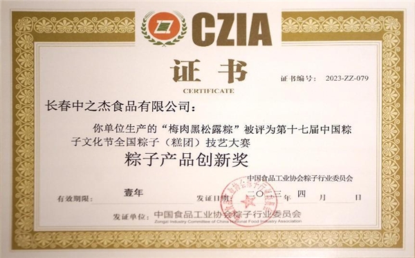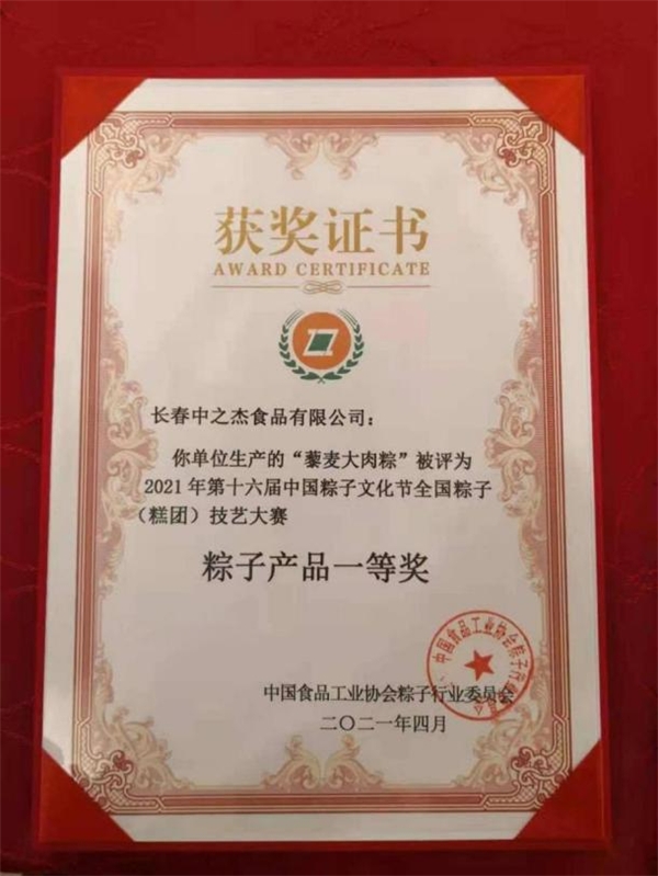 2021年,由中國(guó)食品行業(yè)協(xié)會(huì)舉辦的第16屆中國(guó)粽子文化節(jié)頒獎(jiǎng)儀式上,中之杰“藜麥大黃米粽”獲得最佳創(chuàng)新獎(jiǎng)、“藜麥大肉粽”獲得一等獎(jiǎng)、“藜麥大黃米湯圓”獲得特等獎(jiǎng),可謂是滿(mǎn)譽(yù)而歸。并且這已經(jīng)是中之杰在中國(guó)粽子文化節(jié)上連續(xù)5年蟬聯(lián)最高榮譽(yù)。