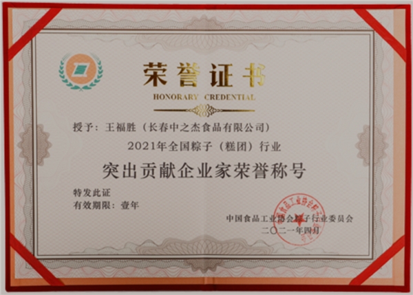 有鑒于中之杰長(zhǎng)久以來(lái)對(duì)弘揚(yáng)粽子文化事業(yè)的貢獻(xiàn),在2021年,中之杰董事長(zhǎng)王福勝先生獲得機(jī)構(gòu)頒發(fā)的“突出貢獻(xiàn)企業(yè)家”稱(chēng)號(hào),體現(xiàn)出中之杰在行業(yè)內(nèi)的領(lǐng)軍實(shí)力和頂流水平。王福勝還帶領(lǐng)中之杰分別榮獲 “長(zhǎng)春民營(yíng)經(jīng)濟(jì)突出貢獻(xiàn)企業(yè)”和“民營(yíng)經(jīng)濟(jì)突出貢獻(xiàn)企業(yè)家”等榮譽(yù)。同時(shí),王福勝還擔(dān)任中國(guó)食品工業(yè)協(xié)會(huì)粽子行業(yè)委員會(huì)會(huì)長(zhǎng)職務(wù),為行業(yè)發(fā)展盡職盡責(zé)。