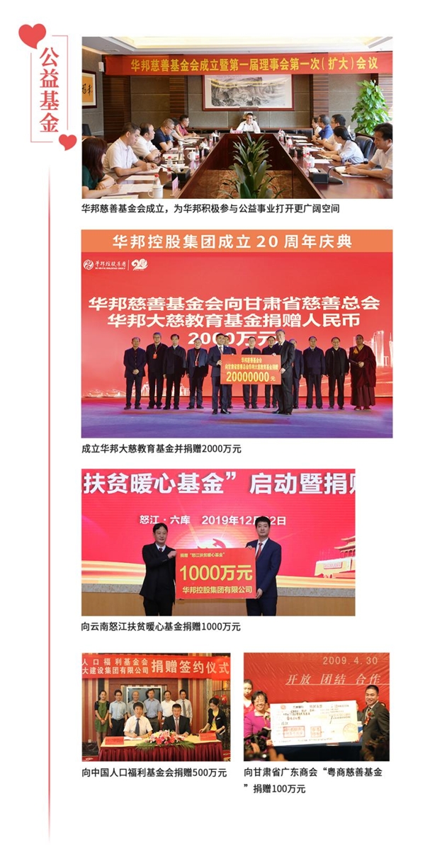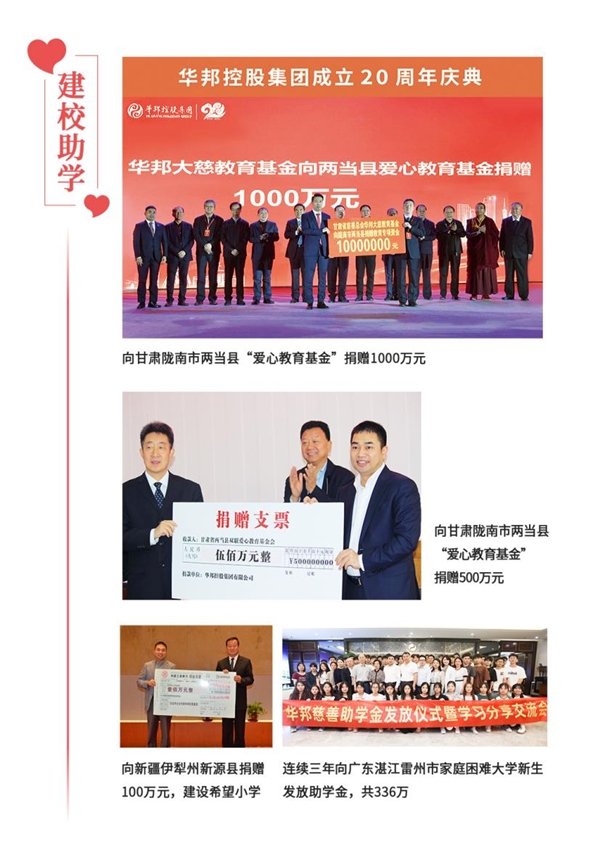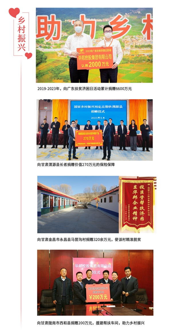 利合一,回報社會。23年來,華邦控股集團不斷發(fā)展壯大,實現(xiàn)高質(zhì)量發(fā)展,得益于時代,得益于黨和政府及社會各界的關(guān)心與支持。助力鄉(xiāng)村振興,僅是華邦履行社會責(zé)任的縮影。華邦作為廣東省百強民營企業(yè),始終心懷感恩,勇于擔(dān)當(dāng),用心用情投身于各項慈善公益事業(yè),回饋社會。迄今為止,華邦在鄉(xiāng)村振興、建校助學(xué)、賑災(zāi)援助等公益領(lǐng)域累計捐款捐物數(shù)億元。