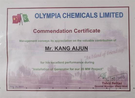 值得一提的是,發(fā)電機各項數(shù)據(jù)經(jīng)過業(yè)主檢測基本都在中間公差,巴基斯坦OLYMPIA CHEMICALS公司管理層對舜云互聯(lián)提供的服務(wù)和售后服務(wù)人員所展現(xiàn)出的精湛的技術(shù),高度的責(zé)任感和使命感表示高度認(rèn)可,并頒發(fā)了《表揚證書》。