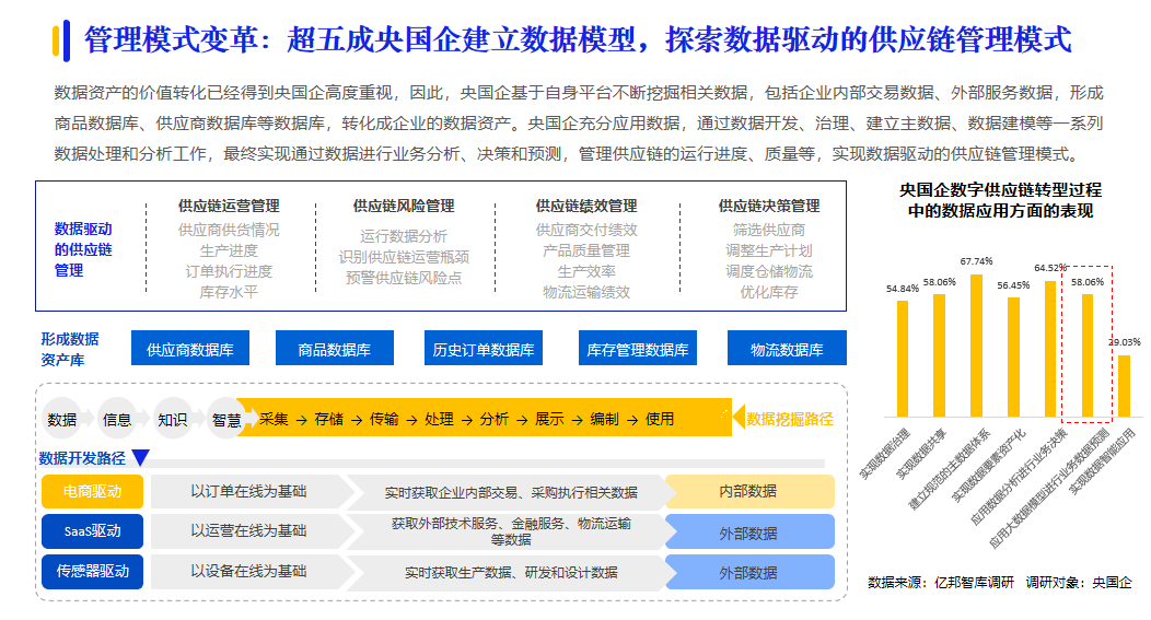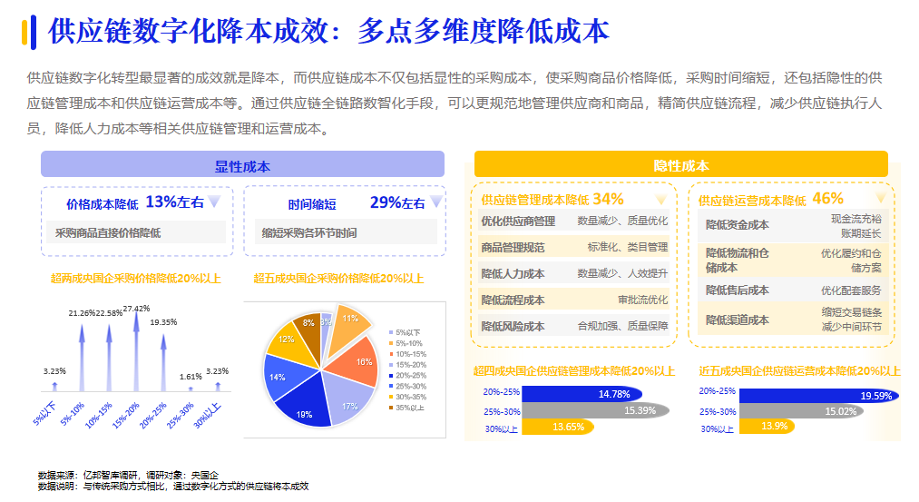 央國企在我國企業(yè)采購數(shù)字化進(jìn)程中的火車頭效應(yīng)越發(fā)明顯。據(jù)億邦智庫調(diào)研,超四成央國企表示數(shù)字化采購滲透率已經(jīng)超過50%;形成了央國企先行,引發(fā)供應(yīng)鏈各環(huán)節(jié)企業(yè)參與數(shù)字化創(chuàng)新變革的發(fā)展態(tài)勢(shì)。