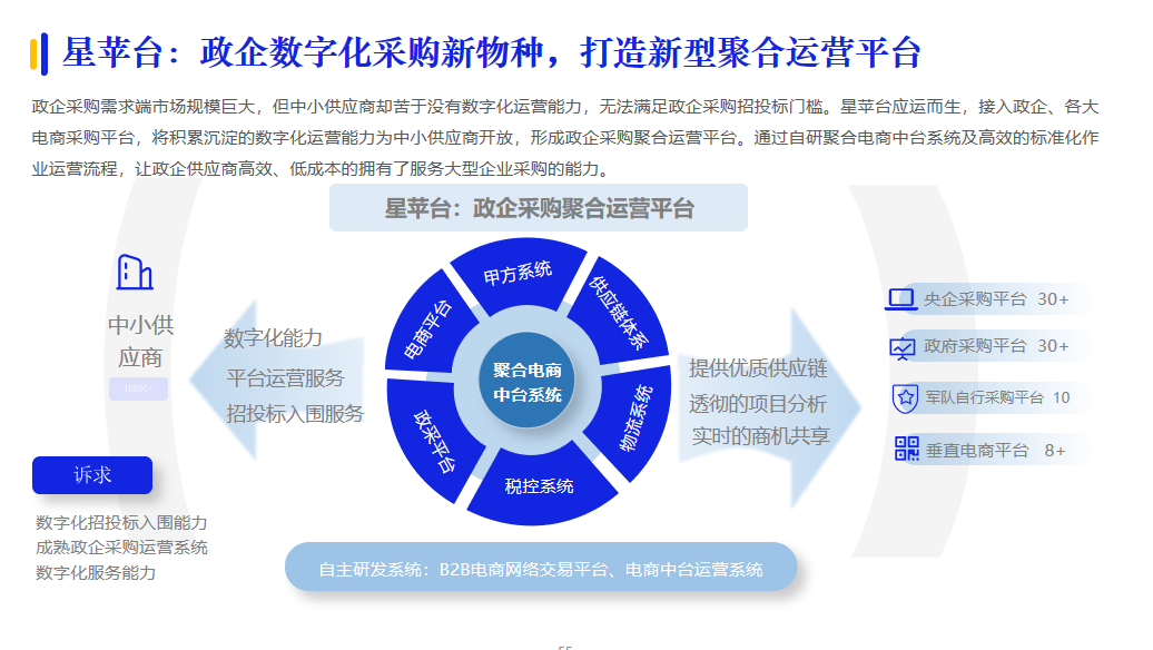 業(yè)務(wù)+數(shù)據(jù)的雙中臺(tái)模式,也是今年技術(shù)服務(wù)商在中臺(tái)方面的創(chuàng)新看點(diǎn)。從業(yè)務(wù)系統(tǒng)獲取的信息經(jīng)過數(shù)據(jù)中臺(tái)的處理,再經(jīng)過業(yè)務(wù)中臺(tái)的分析后,為企業(yè)提供智能決策支持。例如,星蘋臺(tái)通過自研聚合電商中臺(tái)系統(tǒng),接入政企、各大電商采購平臺(tái),將積累沉淀的數(shù)字化運(yùn)營能力為中小供應(yīng)商開放,讓其擁有了服務(wù)大型企業(yè)采購的能力。