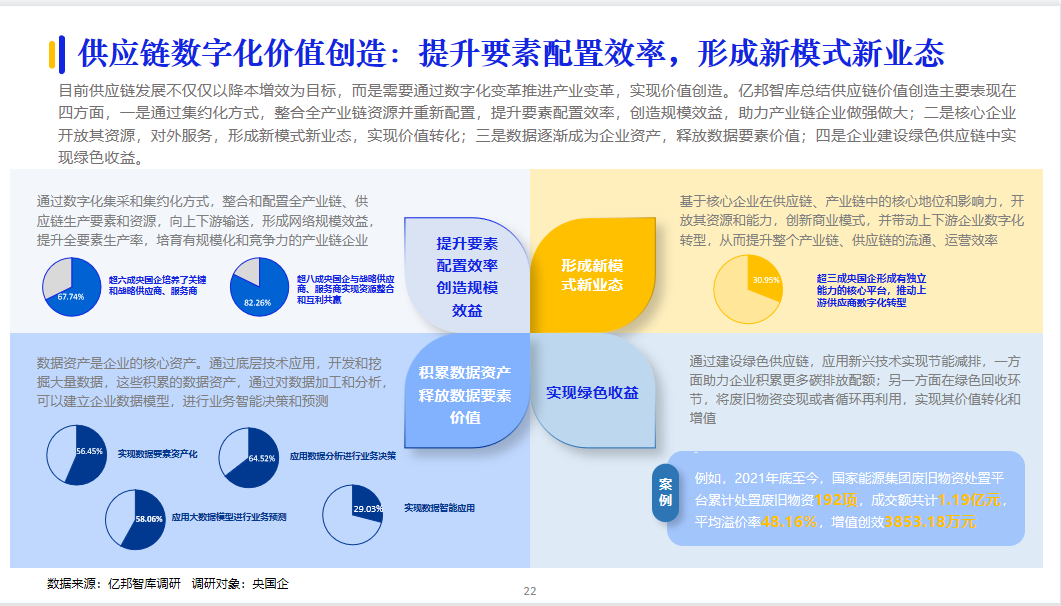 目前供應(yīng)鏈發(fā)展不僅僅以降本增效為目標(biāo),而是需要通過數(shù)字化變革推進(jìn)產(chǎn)業(yè)變革,實(shí)現(xiàn)價(jià)值創(chuàng)造。億邦智庫總結(jié)供應(yīng)鏈價(jià)值創(chuàng)造主要表現(xiàn)在四方面,一是通過集約化方式,整合全產(chǎn)業(yè)鏈資源并重新配置,提升要素配置效率,創(chuàng)造規(guī)模效益,助力產(chǎn)業(yè)鏈企業(yè)做強(qiáng)做大;二是核心企業(yè)開放其資源,對(duì)外服務(wù),形成新模式新業(yè)態(tài),實(shí)現(xiàn)價(jià)值轉(zhuǎn)化;三是數(shù)據(jù)逐漸成為企業(yè)資產(chǎn),釋放數(shù)據(jù)要素價(jià)值;四是企業(yè)建設(shè)綠色供應(yīng)鏈中實(shí)現(xiàn)綠色收益。