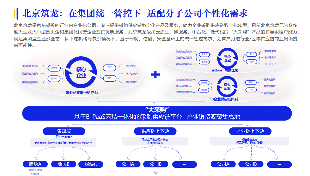 針對(duì)企業(yè)既要滿足標(biāo)準(zhǔn)化,又要滿足定制化業(yè)務(wù)需求,PaaS提供的服務(wù)更具有拓展性、集中性、適配性更強(qiáng)。北京筑龍基于多租戶體系,構(gòu)建了大采購云私一體化B-PaaS平臺(tái),既滿足多層級(jí)集中管理管控需求,又為下屬管理及執(zhí)行機(jī)構(gòu)提供更多個(gè)性化、自主性選擇,進(jìn)而適應(yīng)集團(tuán)多元化和業(yè)務(wù)單元專業(yè)化發(fā)展。