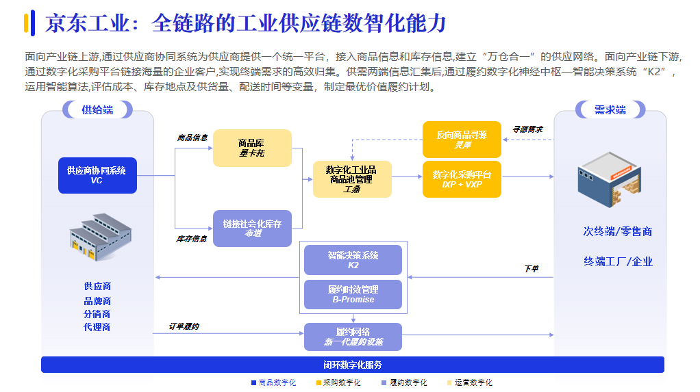 數(shù)字供應(yīng)鏈發(fā)展已經(jīng)從關(guān)注部分環(huán)節(jié)、部分參與者,轉(zhuǎn)向關(guān)注全鏈條、生態(tài),因此,全鏈路數(shù)智供應(yīng)鏈解決方案漸成主流。例如,京東工業(yè)面向產(chǎn)業(yè)鏈上下游,通過供應(yīng)商協(xié)同系統(tǒng)建立“萬倉合一”的供應(yīng)網(wǎng)絡(luò);通過數(shù)字化采購平臺(tái)實(shí)現(xiàn)終端需求的高效歸集,再通過智能決策系統(tǒng)“K2”,制定最優(yōu)價(jià)值履約計(jì)劃。