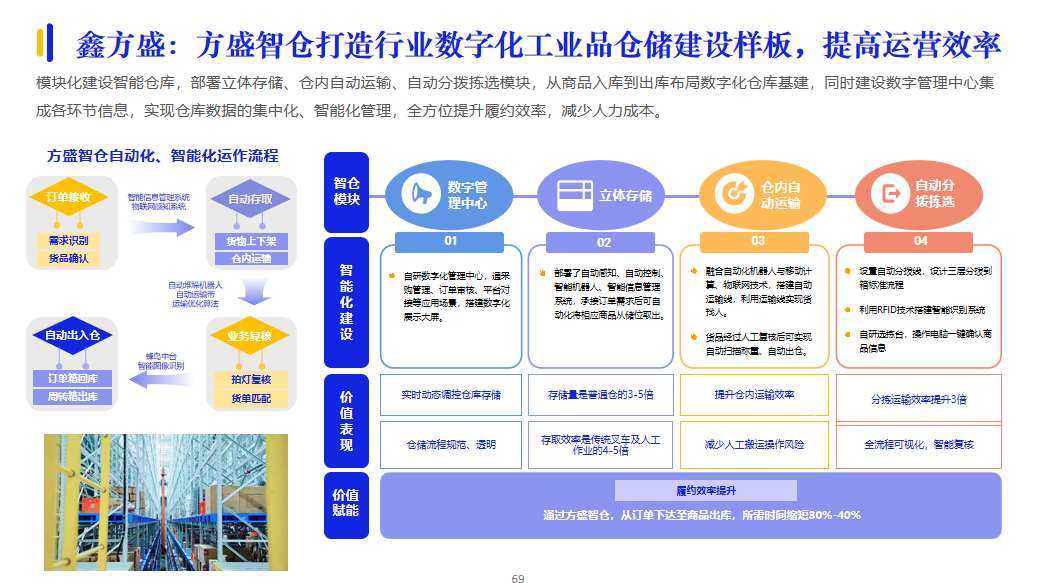 履約能力是供應(yīng)商的核心競(jìng)爭(zhēng)力。在履約服務(wù)方面,為了提高履約交付效率,供應(yīng)商加大AI等技術(shù)投入應(yīng)用,建設(shè)智能倉儲(chǔ)、智慧物流等數(shù)智供應(yīng)鏈體系。例如,鑫方盛的方盛智倉打造行業(yè)數(shù)字化工業(yè)品倉儲(chǔ)建設(shè)樣板,實(shí)現(xiàn)倉庫數(shù)據(jù)的集中化、智能化管理,全方位提升履約效率,減少人力成本。