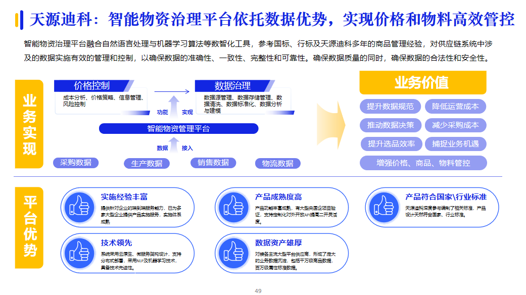 部分央國企會(huì)根據(jù)企業(yè)自身的數(shù)字化薄弱點(diǎn),采取有針對(duì)性地補(bǔ)齊斷點(diǎn)的實(shí)施策略,包括供建立應(yīng)商協(xié)同管理系統(tǒng)、優(yōu)化物資分類與編碼設(shè)計(jì)、建立供應(yīng)商管理體系、建設(shè)電商采購平臺(tái)、設(shè)計(jì)倉儲(chǔ)管理體系等內(nèi)容。例如:天源迪科在智能物資治理方面,提出了價(jià)格和物料高效管控的解決方案,有效確保價(jià)格數(shù)據(jù)的合法性和安全性。