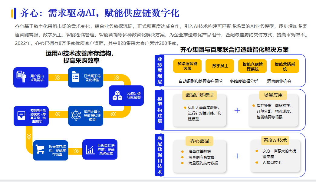 今年還有不少供應(yīng)商在數(shù)字供應(yīng)鏈建設(shè)方面,推出升級(jí)的智能化服務(wù)。比如,齊心引入AI技術(shù)構(gòu)建可匹配多場(chǎng)景的AI業(yè)務(wù)模型,為企業(yè)匹配最佳履約交付方式。