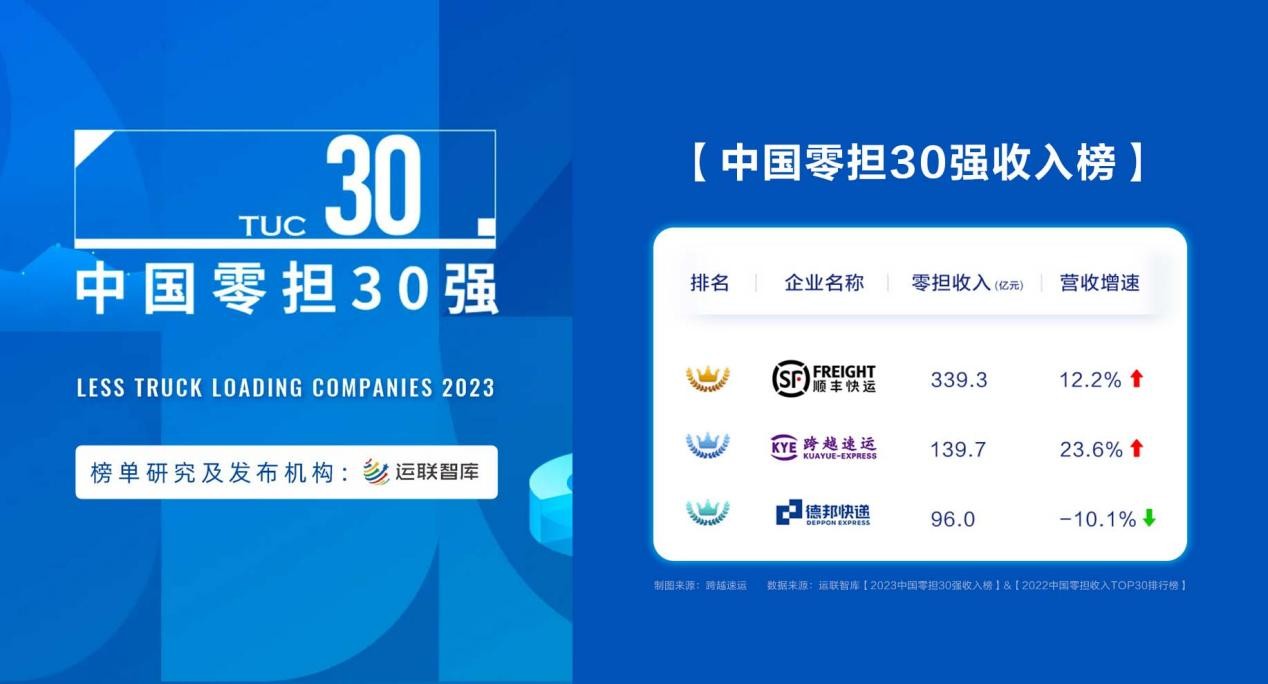 但,過去的16年時間里,就在大家認為快遞領域的競爭進入白熱化階段的時候,跨越卻加速崛起“后來居上”。8月9日,運聯智庫頒布2023中國零擔排行榜,跨越以139.7億總營收蟬聯榜單第二名(第一是順豐,第三是德邦),營收增速逆勢提升到23.6%,領跑榜單三甲企業(yè)(順豐12.2%,德邦-10.1%)。