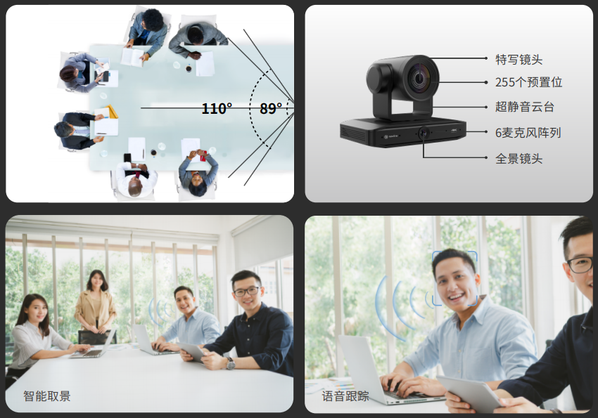 攝像系統(tǒng)由12倍光學(xué)變焦特寫鏡頭和110°大廣角的全景鏡頭組成,特寫鏡頭可視角達(dá)89°,可將畫面無損放大至12倍,加上自動對焦,不僅能捕捉所有參會人的表情和動作,會議室中的文件和白板內(nèi)容都能在遠(yuǎn)端輕松觀看。同時,作為一款會議云臺攝像頭,它能通過6顆麥克風(fēng)陣列,鎖定發(fā)言人位置,電機(jī)實(shí)時穩(wěn)定安靜快速地運(yùn)行轉(zhuǎn)動到當(dāng)前發(fā)言人,覆蓋會議室多個角度,讓遠(yuǎn)程的參會人更具沉浸感和參與感。