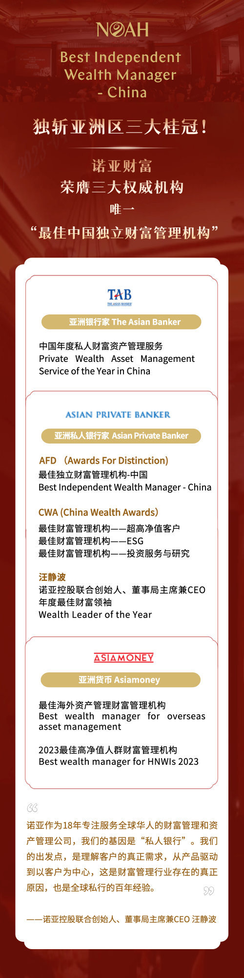 3月27日,諾亞財(cái)富在第五屆《亞洲私人銀行家》(Asian Private Banker)中國財(cái)富獎(China Wealth Awards)評選中斬獲四大榮譽(yù)的優(yōu)異成績,在“超高凈值客戶”、“ESG”、“投資服務(wù)與研究”和“年度最佳財(cái)富領(lǐng)袖”個人成就獲得權(quán)威認(rèn)可。在此前的3月8日,諾亞亦作為中國區(qū)唯一獲獎財(cái)富管理公司榮獲《亞洲私人銀行家》亞洲區(qū)“2022中國最佳獨(dú)立財(cái)富管理機(jī)構(gòu)”,受邀與法國巴黎銀行、摩根私人銀行、匯豐銀行、花旗銀行、瑞士信貸銀行、澳大利亞國民銀行、國泰世華等國際私人銀行及財(cái)富管理標(biāo)桿一同出席于中國香港舉辦的盛典,也是諾亞財(cái)富第六年獲得亞洲私人銀行家的多項(xiàng)認(rèn)可。