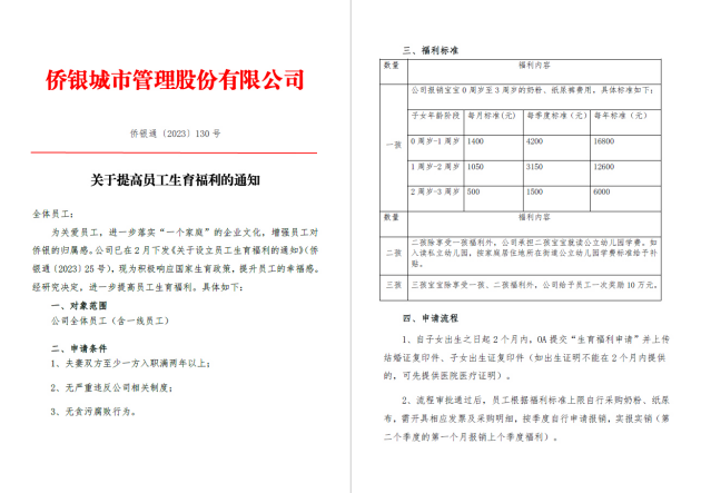 近日,一份僑銀股份新出臺(tái)的《關(guān)于提高員工生育福利的通知》流出,瞬間爆火全網(wǎng)引發(fā)熱議,網(wǎng)友紛紛大呼“神仙公司還招人嗎?”“報(bào)上地址,讓我來(lái)!”