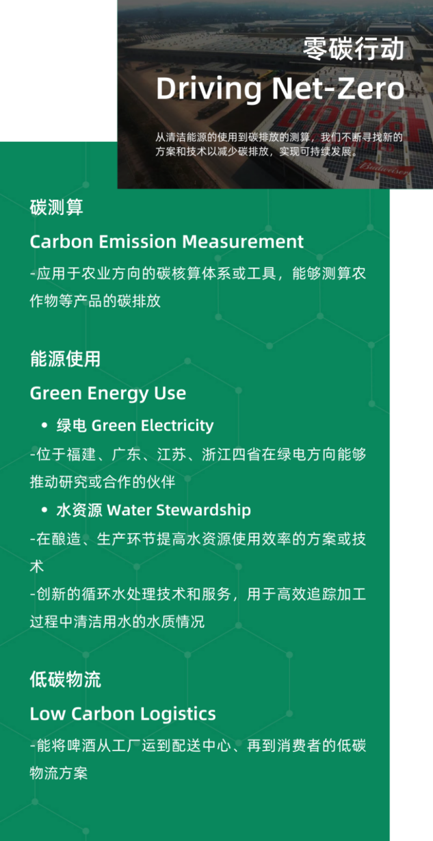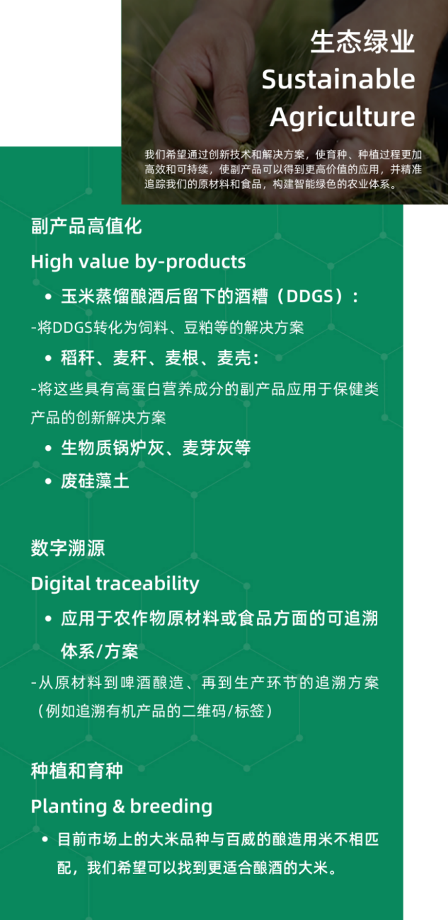 每一年,100+創(chuàng)新中心都會(huì)在價(jià)值鏈上梳理亟待解決的可持續(xù)發(fā)展挑戰(zhàn)議題并公開招募創(chuàng)新解決方案,目標(biāo)是讓你的想法得到驗(yàn)證并實(shí)現(xiàn)商業(yè)化應(yīng)用,在試點(diǎn)完成后能夠獲得更大的商業(yè)合同,與百威中國以及更多伙伴建立強(qiáng)有力的合作。