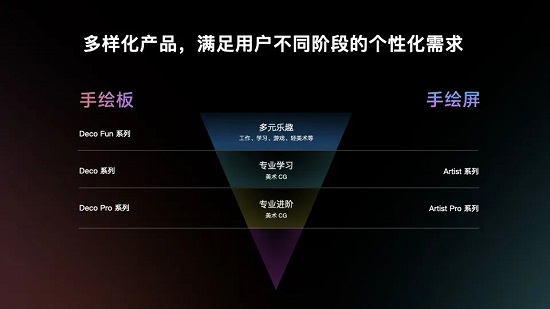 目前,XPPen 共有 2 大品類(lèi),5 大系列產(chǎn)品,包括數(shù)位板類(lèi)的 Deco Fun、Deco、Deco Pro 系列及數(shù)位屏類(lèi) Artist、Artist Pro 系列產(chǎn)品。其中,Deco Fun 產(chǎn)品線系列面向多元樂(lè)趣用戶;Deco 和 Artist 產(chǎn)品線系列面向?qū)I(yè)學(xué)習(xí)用戶;Deco Pro 和 Artist Pro 產(chǎn)品線系列面向?qū)I(yè)進(jìn)階用戶。全新的產(chǎn)品布局,可針對(duì)不同成長(zhǎng)階段的用戶需求,打造從興趣入門(mén)到專(zhuān)業(yè)學(xué)習(xí)再到專(zhuān)業(yè)進(jìn)階的產(chǎn)品矩陣。