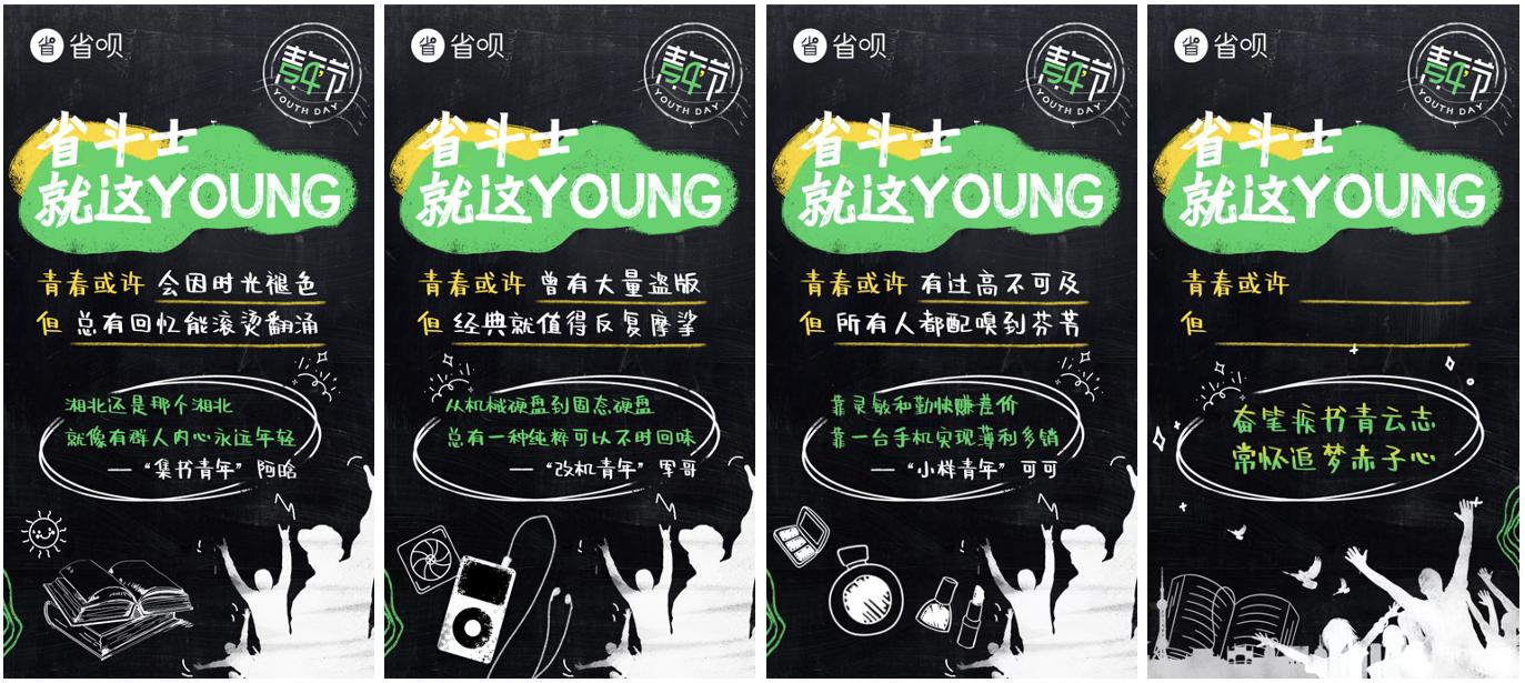 風(fēng)好正是揚帆時,策馬揚鞭再奮蹄。和集書青年阿晗、改機青年軍哥、小樣青年可可這樣將愛好做成生意的人還有很多,他們也是無數(shù)年輕追夢人的代表,有著這個時代后浪群體的可貴品質(zhì)。恰逢五四青年節(jié),數(shù)字化優(yōu)惠服務(wù)平臺省唄也為這些年輕的“省斗士”歡呼喝彩,一組#省斗士 就這YOUNG#的海報,不僅描繪出上述青年代表的風(fēng)貌,還以“青春或許_______,但_______”的句式引發(fā)網(wǎng)友的共鳴,激發(fā)年輕人表達(dá)內(nèi)心炙熱,以真誠博取喝彩與鼓勵。“青春或許稍縱即逝,但造就了全新的自己”、“ 青春或許是這白開水一樣淡的日子,但更多的還是相互成就和相互溫暖”、……短短半天不到,話題閱讀量就已突破1600萬。
