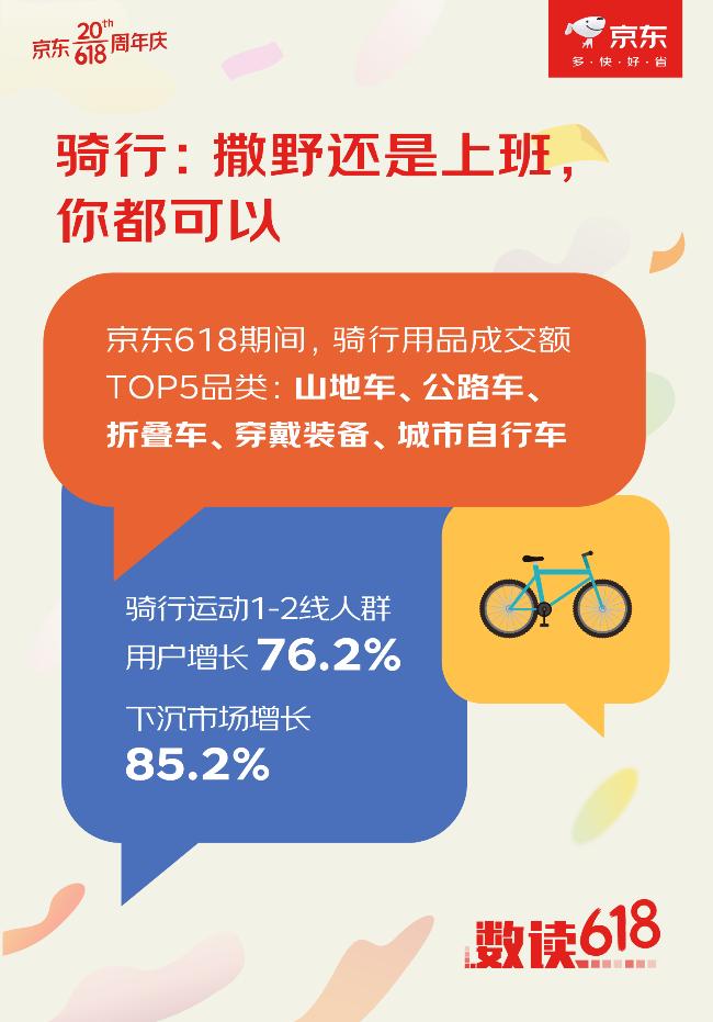 京東騎行數(shù)據(jù)顯示,騎行在今年應(yīng)該可以拿下增速最高的戶外類目頭牌。其中分(專業(yè)、非專業(yè)、泛潮)公路車、山地車、青少年自行車、電助力車、城市通勤自行車等,品類十分豐富,能很好地滿足騎行達(dá)人們的“步履不停”的酷炫運(yùn)動(dòng)生活。