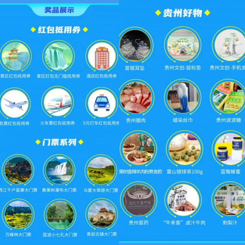 本次盲盒活動獎品重點突出貴州省內(nèi)景點、文創(chuàng)產(chǎn)品、特色美食。從貴州重點景區(qū)如西江千戶苗寨、黃果樹瀑布、烏蒙大草原、荔波小七孔的大門票,到苗銀耳墜、貴州臘肉、蠟染絲巾、貴州波波糖、貴州苗藥等貴州好物,好玩、好吃、好用一應(yīng)俱全。此外,盲盒還提供景區(qū)、酒店、機票、火車票、打車紅包抵用券,誠意滿滿。