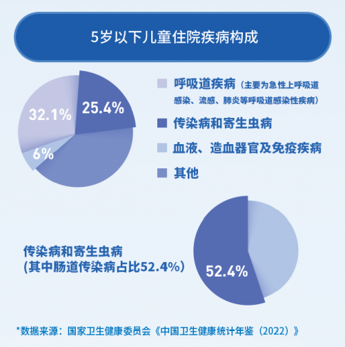 調(diào)查報告也顯示,0-14歲兒童住院病人中,5歲以下兒童占比65%,而住院疾病構成中,呼吸系統(tǒng)疾病和腸道傳染病總體占比近50%,為住院疾病負擔主因。如何提高兒童免疫力,成了保障兒童健康的關鍵因素。