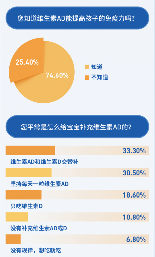 調(diào)查報告還顯示,雖然7成的家長認可維生素AD對提高免疫力的作用,但有7成的家長用錯了方法,比如選擇AD和D交替補、只補D不補A、補補停停等。專家提醒,家長一定要重視孩子日常營養(yǎng)的攝入,堅持每天補充維生素AD是最佳方案。