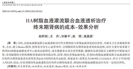 8月1日,國(guó)家衛(wèi)生健康委衛(wèi)生發(fā)展研究中心、國(guó)家藥物與衛(wèi)生技術(shù)綜合評(píng)估中心趙琨研究員等的研究成果《HA樹(shù)脂血液灌流聯(lián)合血液透析治療終末期腎病的成本-效果分析》發(fā)表于《衛(wèi)生經(jīng)濟(jì)研究》雜志。