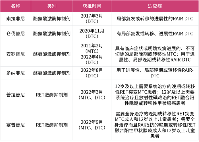 目前,已有多種靶向藥物在國(guó)內(nèi)獲批用于治療晚期甲狀腺癌: