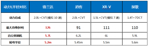 綜合幾款車的動力參數(shù)對比,可以發(fā)現(xiàn)在賬面數(shù)據(jù)上,鋒蘭達(dá)的動力表現(xiàn)明顯更有優(yōu)勢,得益于這款2.0L發(fā)動機(jī)的排量優(yōu)勢,其最大功率達(dá)到126kW,不管是與探歌的1.4T發(fā)動機(jī),還是排量相同的逍客2.0L發(fā)動機(jī),鋒蘭達(dá)都有著明顯的動力優(yōu)勢。