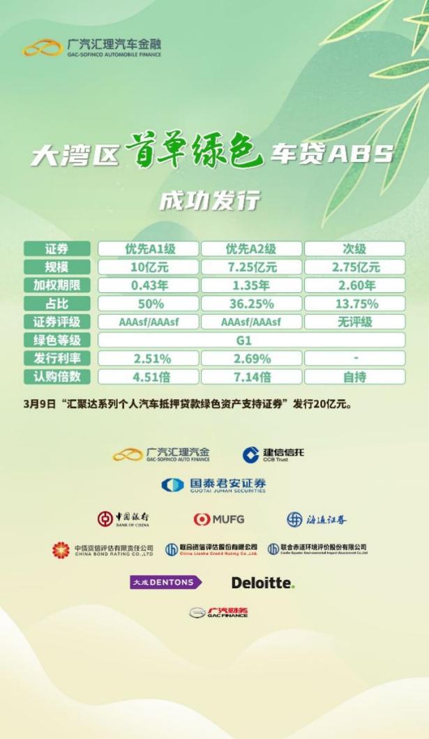 與此同時,廣汽匯理良好的綠色金融資產(chǎn)也獲得了資本市場的認可。今年3月9日,廣汽匯理發(fā)行了粵港澳大灣區(qū)首單綠色車貸ABS——匯聚達2023年第一期個人汽車抵押貸款綠色資產(chǎn)支持證券。本次入池資產(chǎn)均為廣汽埃安品牌新能源汽車個人貸款,經(jīng)綠色認證機構(gòu)聯(lián)合赤道評估分析,入池資產(chǎn)對應(yīng)的新能源汽車,預(yù)計每年可實現(xiàn)二氧化碳減排6.07萬噸,節(jié)約標準煤2.85萬噸,有效地助力了我國節(jié)能減排事業(yè)開展。