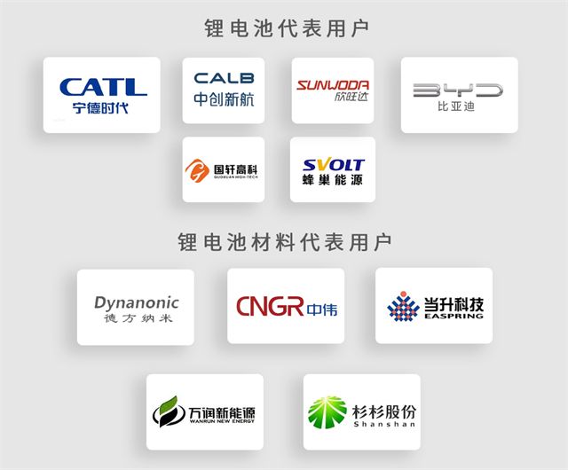 鋰電池企業(yè):寧德時(shí)代?,比亞迪?,中創(chuàng)新航,國(guó)軒高科,欣旺達(dá),蜂巢能源等。鋰電材料企業(yè):德方納米,中偉股份,當(dāng)升科技,湖北萬潤(rùn),杉杉股份等,均為我公司長(zhǎng)期用戶。