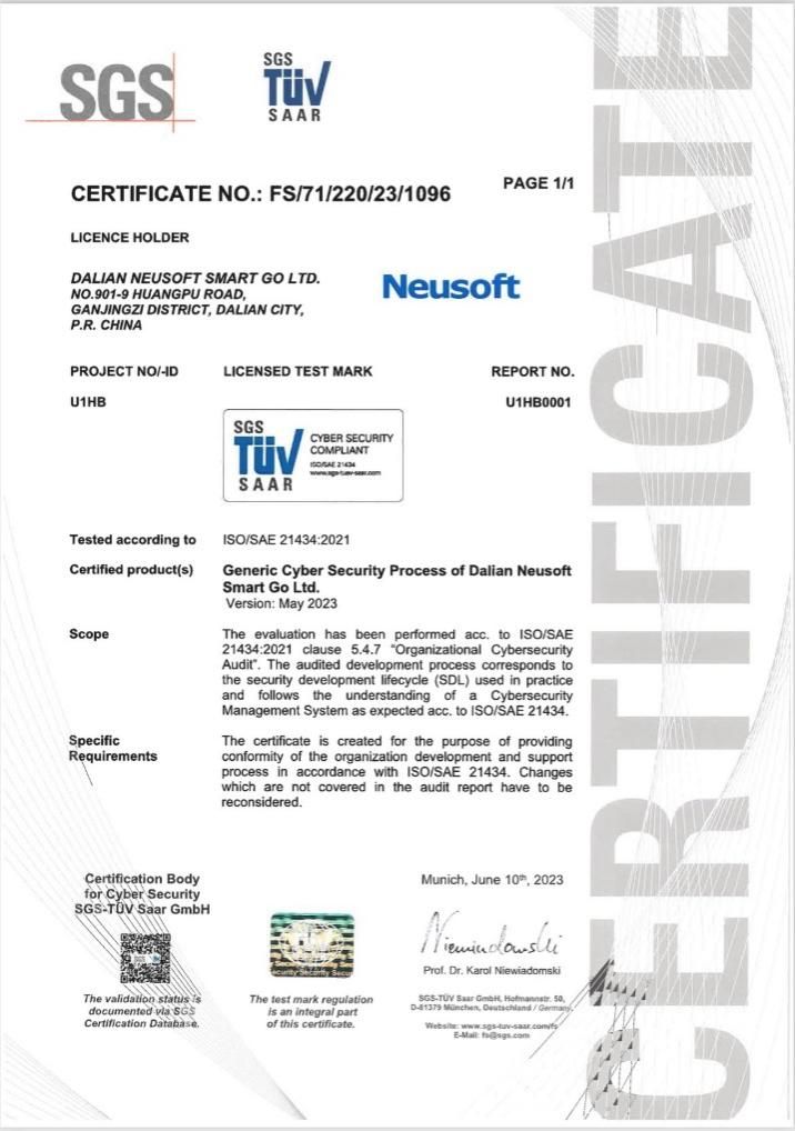 從產(chǎn)品開(kāi)發(fā)到組織管理,東軟將汽車電子與網(wǎng)絡(luò)安全高度融合,形成一整套汽車網(wǎng)絡(luò)安全管理流程,覆蓋智能網(wǎng)聯(lián)汽車安全的整個(gè)生命周期,踐行對(duì)客戶持續(xù)全面保障網(wǎng)絡(luò)安全服務(wù)的鄭重承諾,也由此順利完成管理體系認(rèn)證的全部?jī)?nèi)容并獲得了認(rèn)證證書(shū),得到了SGS的高度稱贊。