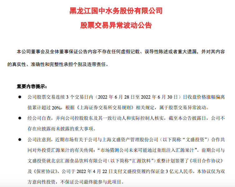 6月30日晚間,國中水務(wù)發(fā)布《股票交易異常波動公告》稱,公司注意到,近期市場有關(guān)于公司與文盛投資合作共同對外投資匯源果汁的有關(guān)傳聞:“市場猜測公司未來可能通過重組注入?yún)R源果汁”。經(jīng)公司核查如下:前期公司與文盛投資就匯源飲料重整計劃簽署了《項目合作協(xié)議》及《保密協(xié)議》,公司于2022年4月22日支付文盛投資履約保證金3億元,本協(xié)議僅為雙方意向性投資,不保證公司最終能參與此項目。