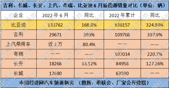 中國經(jīng)濟網(wǎng)記者通過梳理廠家公開的數(shù)據(jù)和乘聯(lián)會發(fā)布的數(shù)據(jù)發(fā)現(xiàn),6月,比亞迪乘用車、吉利、長安乘用車、長城的銷量分別為133762輛、126595輛、118303輛、101186輛,同比分別上漲168.8%%、26%、37.6%、0.52%;上半年累計銷量分別為641350輛、613842輛、629175輛、518525輛,同比分別上漲314.9%、-3%、-4.61%、-16.12%。?