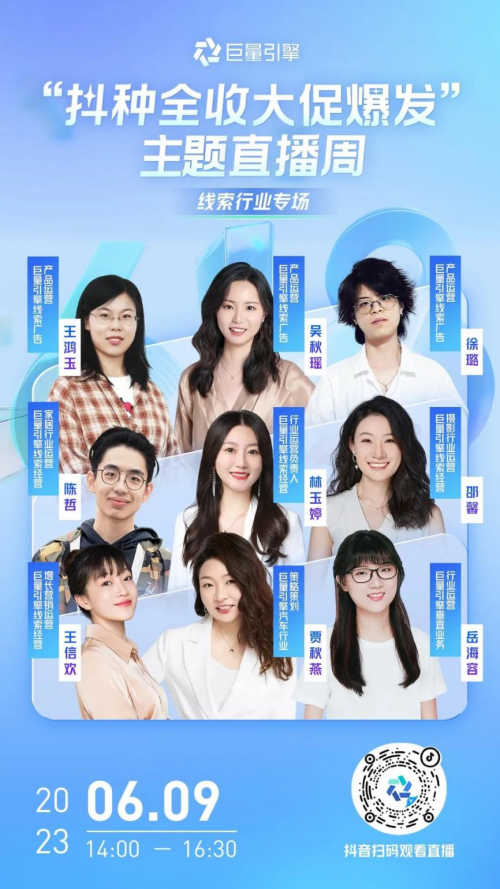 關(guān)注“巨量引擎小助手”抖音號(hào),6月9日14:00,來(lái)線索行業(yè)618直播專(zhuān)場(chǎng),了解更多活動(dòng)政策及作戰(zhàn)攻略。