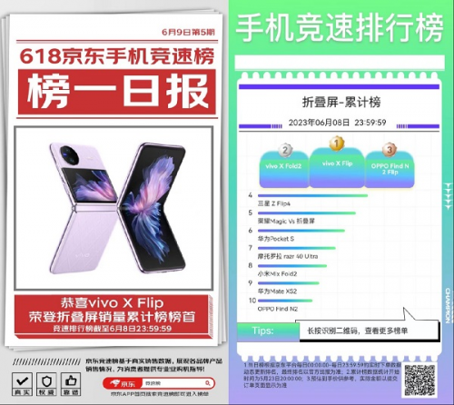 最近京東618火熱進(jìn)行中,囤完日用品,也該將自己卡頓或拍攝性能落后的手機(jī)換新了。除了性能出色的直板智能機(jī),還可以選擇嘗鮮,換新折疊屏手機(jī)試試。不過(guò)很多人都表示自己平時(shí)也不關(guān)注手機(jī)圈的事情,配置也就看個(gè)大概,不知道怎么選。沒(méi)關(guān)系,京東618推出了手機(jī)競(jìng)速排行榜,京東APP搜索“競(jìng)速榜”即可進(jìn)入,不同喜好和預(yù)算都能選到適合的產(chǎn)品,其中就有折疊屏手機(jī)銷(xiāo)量累計(jì)榜。截至6月8日,vivo X Flip、vivo X Fold2、OPPO Find N2 Flip成為折疊屏手機(jī)銷(xiāo)量累計(jì)榜TOP3,下面就帶大家一起看看這些在榜折疊屏手機(jī)。