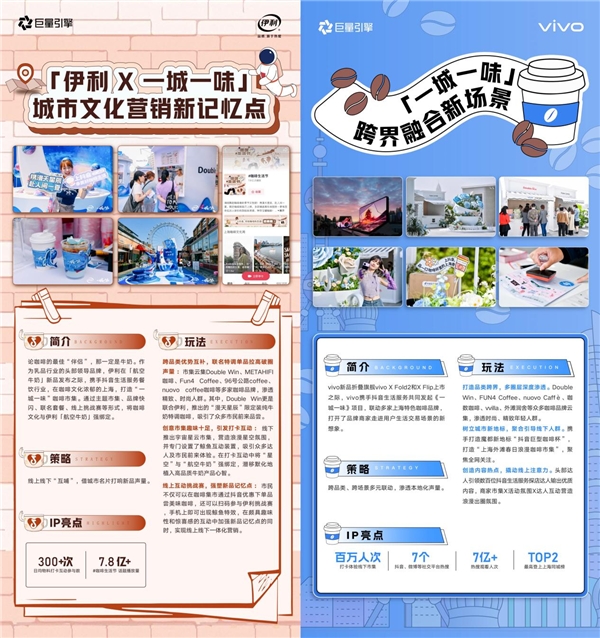 在垂類(lèi)營(yíng)銷(xiāo)層面,抖音生活服務(wù)打造《一城一味》IP,分別聯(lián)合vivo、伊利開(kāi)展跨界營(yíng)銷(xiāo),借由上??Х任幕芗啊翱Х仁小钡某鞘形幕?通過(guò)線(xiàn)上種草、線(xiàn)下聚合客流打卡體驗(yàn)的方式,將品牌新品融入用戶(hù)高頻生活場(chǎng)景,有力強(qiáng)化上海本地消費(fèi)者對(duì)新品的認(rèn)知。
