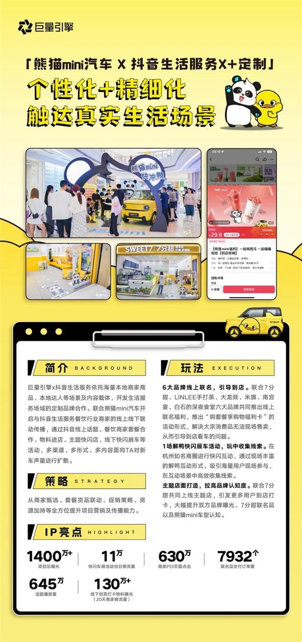 針對(duì)線(xiàn)索獲取成本高、轉(zhuǎn)化鏈路長(zhǎng)等痛點(diǎn),抖音生活服務(wù)聯(lián)手熊貓mini,攜手七分甜、LINLEE手打茶等六大品牌打造聯(lián)名福利,并在核銷(xiāo)等生活場(chǎng)景中植入新車(chē),既擴(kuò)散新車(chē)聲量,又高效收集高意向線(xiàn)索。
