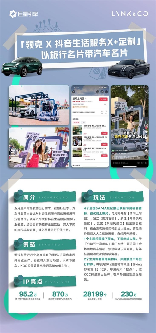 針對(duì)領(lǐng)克汽車(chē)亟需打響“旅游出行必選車(chē)”的需求,抖音生活服務(wù)酒旅商家首次與汽車(chē)客戶(hù)領(lǐng)克進(jìn)行聯(lián)動(dòng),將領(lǐng)克汽車(chē)帶進(jìn)全國(guó)景區(qū)、主題樂(lè)園、營(yíng)地等旅行場(chǎng)景,推動(dòng)“汽車(chē)+旅游”新融合,宣揚(yáng)“領(lǐng)克汽車(chē)=旅行新選擇”品牌價(jià)值主張。