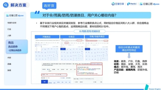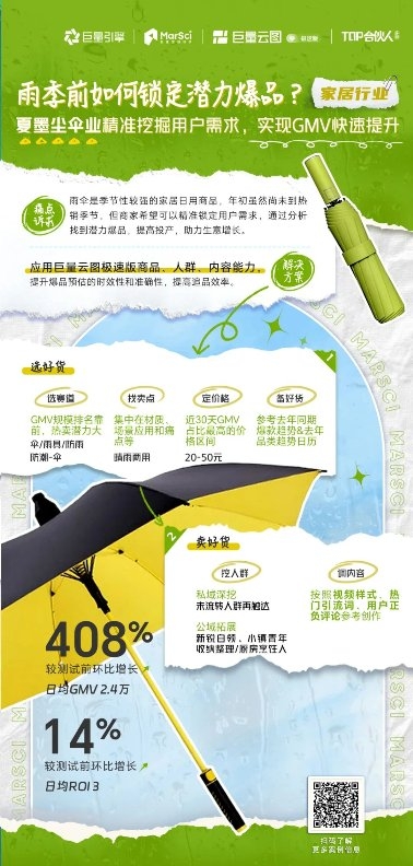 作為家居百貨行業(yè)代表,雨傘品類季節(jié)性更強(qiáng),上述問題也更為凸顯,年初雖然尚未到雨季熱銷節(jié)點(diǎn),但工廠希望可以精準(zhǔn)鎖定用戶需求,提前儲(chǔ)備新的爆品,未雨綢繆。如何準(zhǔn)確選出潛力爆品,并篩選精準(zhǔn)人群提高投產(chǎn),助力生意增長(zhǎng)?