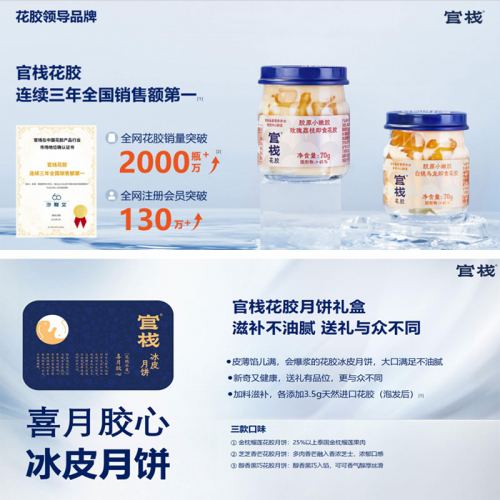 官棧極其重視此次展會(huì),不僅帶來(lái)6大主力產(chǎn)品線,包括鮮燉花膠、即食花膠、輕食花膠、花膠料理、干花膠和季節(jié)限定禮盒;還帶來(lái)兩款重磅新品:港式花膠羹,以及首次對(duì)外展示的《溏心風(fēng)暴之家好月圓》IP聯(lián)名款花膠流心月餅禮盒,從而帶給采購(gòu)商更多選擇。