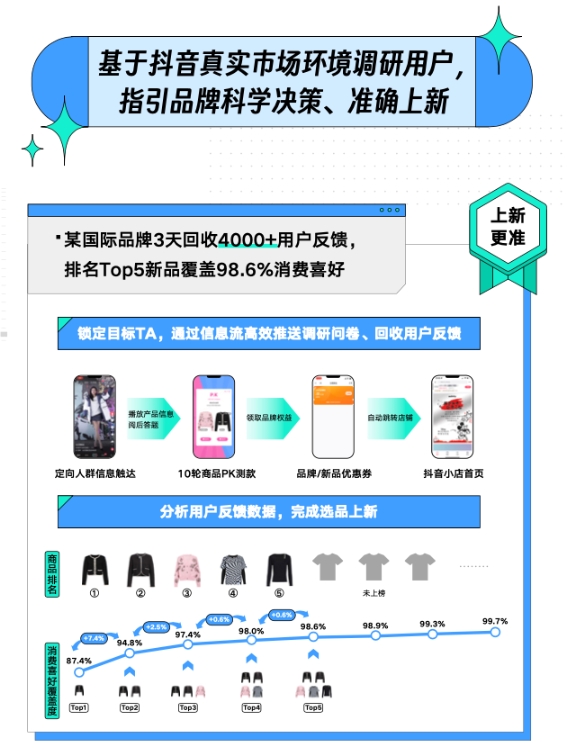 某國(guó)際服裝品牌在選品上新時(shí)使用巨量云圖“新品實(shí)驗(yàn)室”的測(cè)品能力,僅用時(shí)三天就回收了超過(guò)4000份目標(biāo)用戶反饋,選出的貨品,也成為后續(xù)品牌直播間銷量冠軍,為店鋪GMV的主力貢獻(xiàn)商品。獲得這樣的上新成績(jī)是因?yàn)榫蘖吭茍D在測(cè)品的每個(gè)細(xì)節(jié)都試圖降低誤差,從而最大程度還原消費(fèi)者真實(shí)意愿。