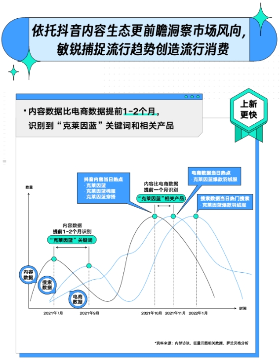 看似無(wú)序的消費(fèi)決策遵循一套基礎(chǔ)邏輯,比如購(gòu)買普遍發(fā)生在瀏覽和搜索之后。所以,內(nèi)容數(shù)據(jù)和搜索數(shù)據(jù)可以被視為交易的前置指標(biāo),它們能夠更早預(yù)測(cè)未來(lái)交易走向。正是基于這一結(jié)論,擁有內(nèi)容場(chǎng)監(jiān)測(cè)能力的巨量云圖能更快識(shí)別出新品市場(chǎng)機(jī)會(huì),為品牌上新提供參考。