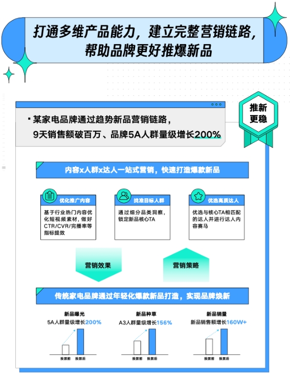如果說(shuō)前期洞察和測(cè)品是成功的基石,那么能否應(yīng)對(duì)上市后的這些問(wèn)題,決定了新品可否走好成功前的最后一里路。在「新品C位出道指南」中,巨量云圖場(chǎng)景運(yùn)營(yíng)模塊下的「趨勢(shì)新品營(yíng)銷」等功能讓品牌推新更穩(wěn)健。