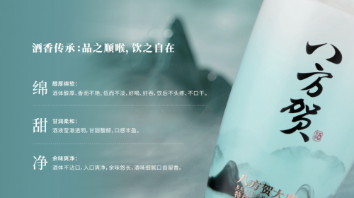 「八方賀特級清香型白酒」,傳承中華古法釀造工藝彰顯酒體釀造智慧。采用清蒸二次清工藝、地缸發(fā)酵、古法蒸餾的傳統(tǒng)清蒸發(fā)酵法釀造,盡顯清香白酒的醇厚綿軟、甘潤柔和;三款白酒宛如歷史的古舊卷軸,在感官的呼喚下,展開了一幅醇香的畫卷。