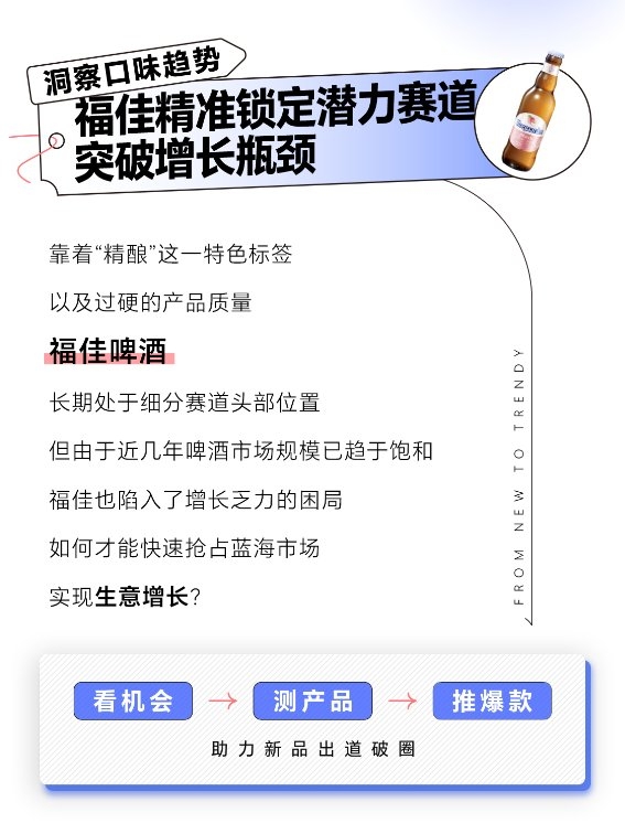 福佳啤酒在巨量云圖“新品推爆”全能力的加持下,通過商品多維度洞察快速了解市場趨勢,并利用「新品實驗室」進(jìn)行敏捷、準(zhǔn)確地測品,有效降低上新試錯成本,精準(zhǔn)定位潛力貨品、高價值人群以及營銷場景,在實現(xiàn)短期生意增量爆發(fā)的同時,也為品牌在抖音平臺長效經(jīng)營累積了人群資產(chǎn)。